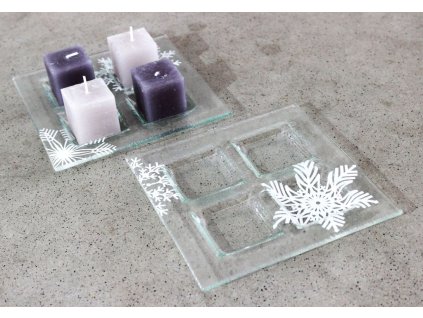 Jednoduchý čirý svícen na 4 svíčky o rozměru 17,5x17,5cm. Jemný dekor bílých sněhových vloček. Může sloužit jako adventní svícen.