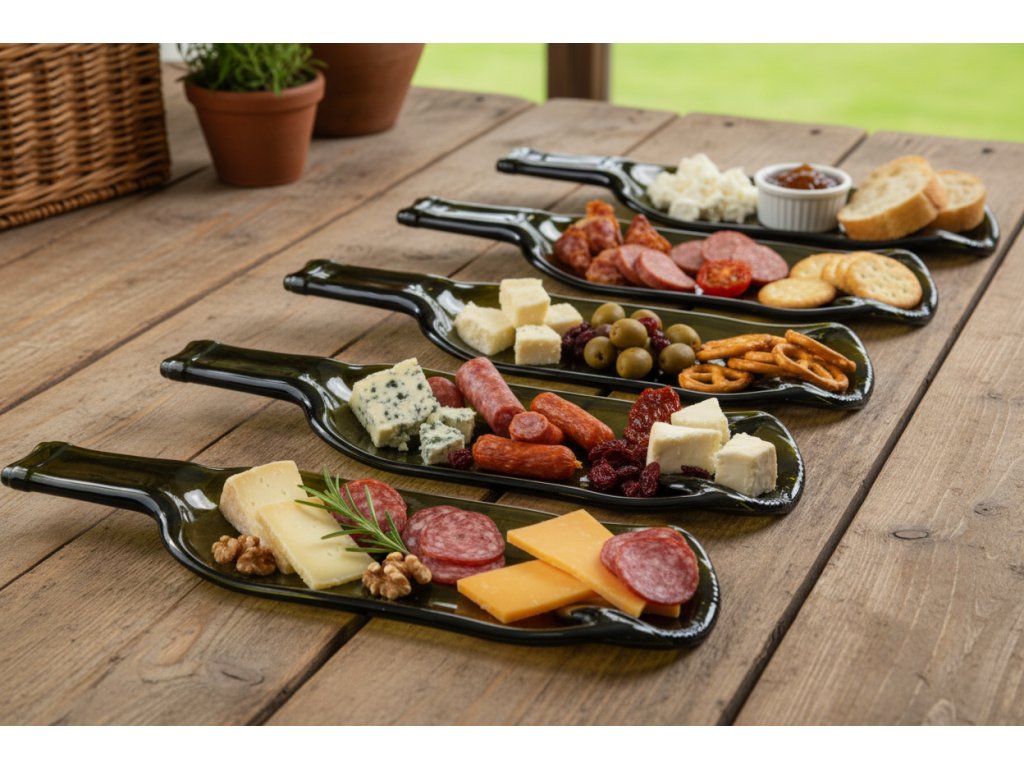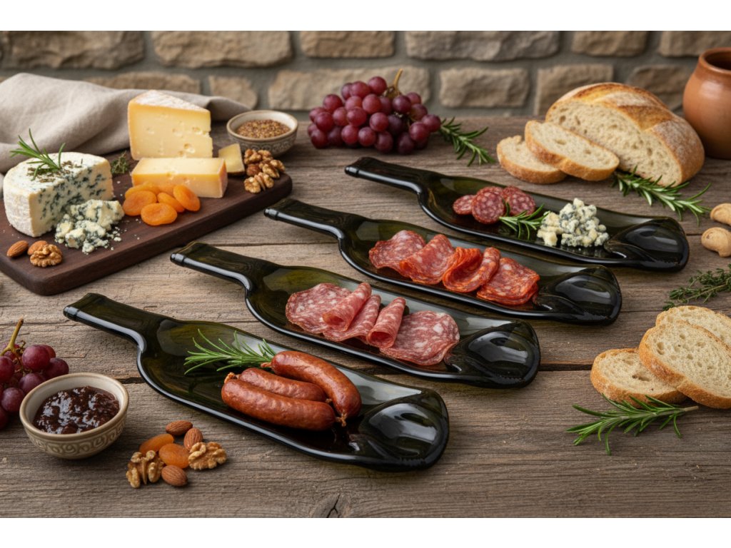 Originální servírovací tác, který vzniká přetvořením klasické vínové láhve typu Bordeaux (0,75 l) v naší dílně. Láhev se při vysoké teplotě tvaruje na formu, aby se dobře držela a pohodlně se z ní servírovalo. Zvýšené okraje udrží na místě i ty nejmenší dobroty – od oliv a cherry rajčátek po pralinky. Perfektní na sýry, uzeniny, zeleninu či drobné ovoce a skvělý „icebreaker“ na každé návštěvě. K dobrému vínu ideální doplněk.