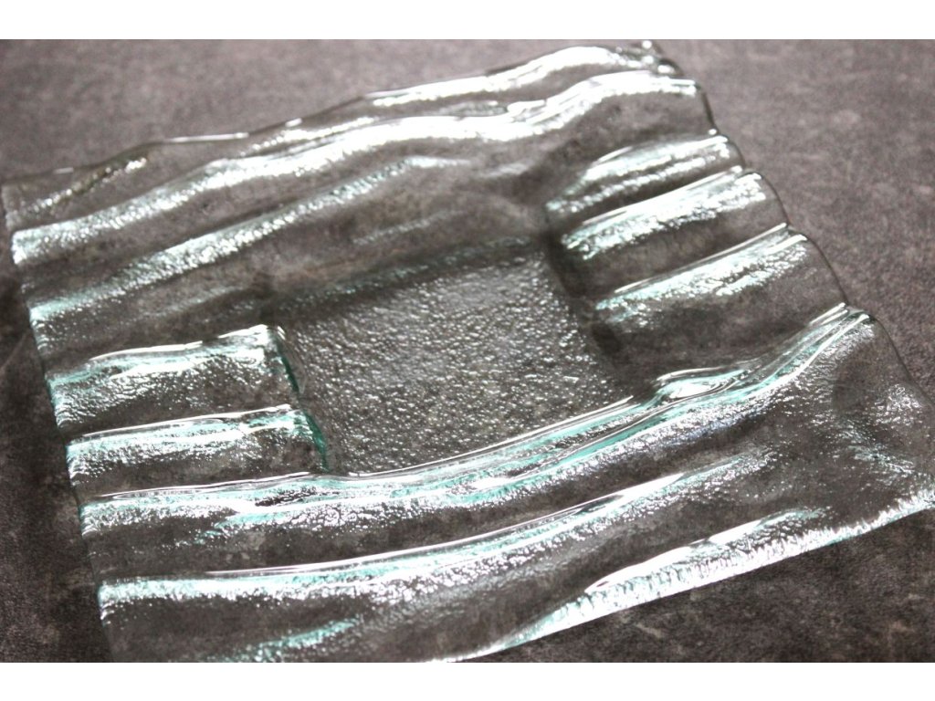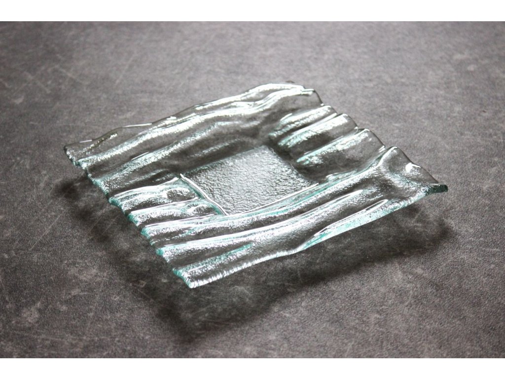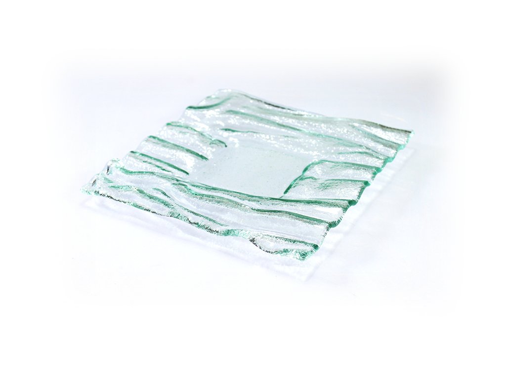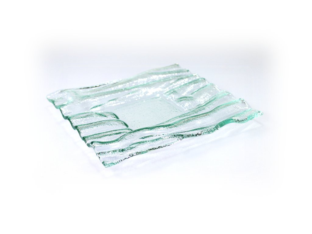 Lehaný skleněný čtvercový talíř vyrábíme ve 3 rozměrech: 31x31cm, 26x26cm a 20x20cm