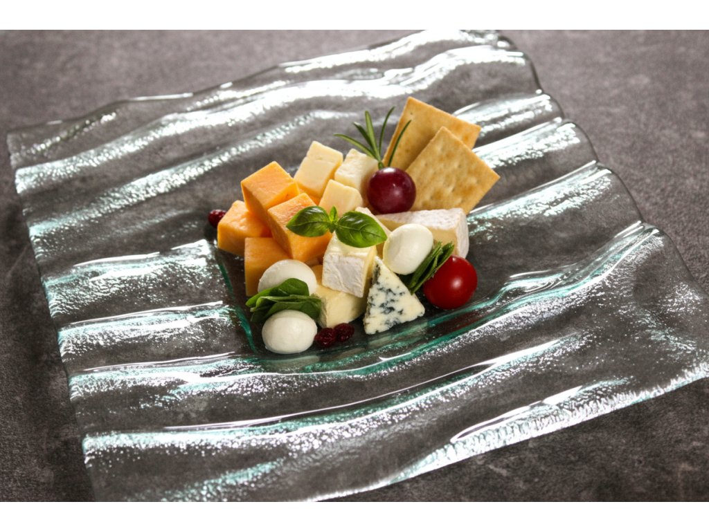 Elegantní čirý tác na studené mísy, chlebíčky, dorty, zákusky nebo jednohubky. Rozměr 31 x 31 cm je ideální pro pohoštění na vaši oslavě.