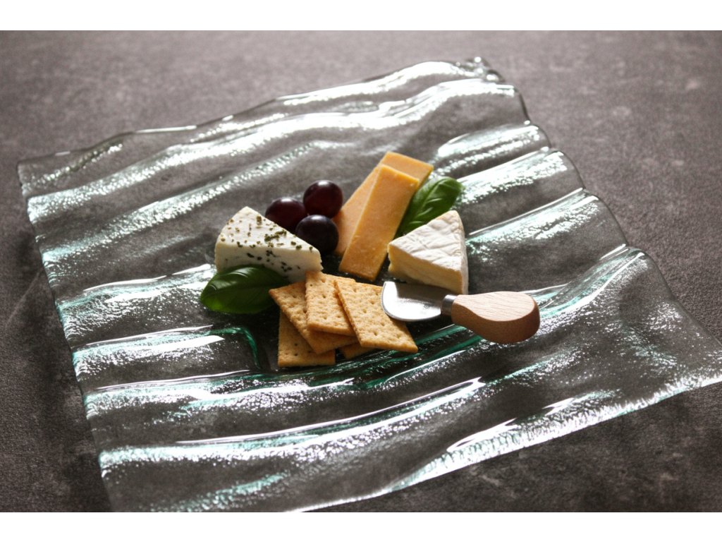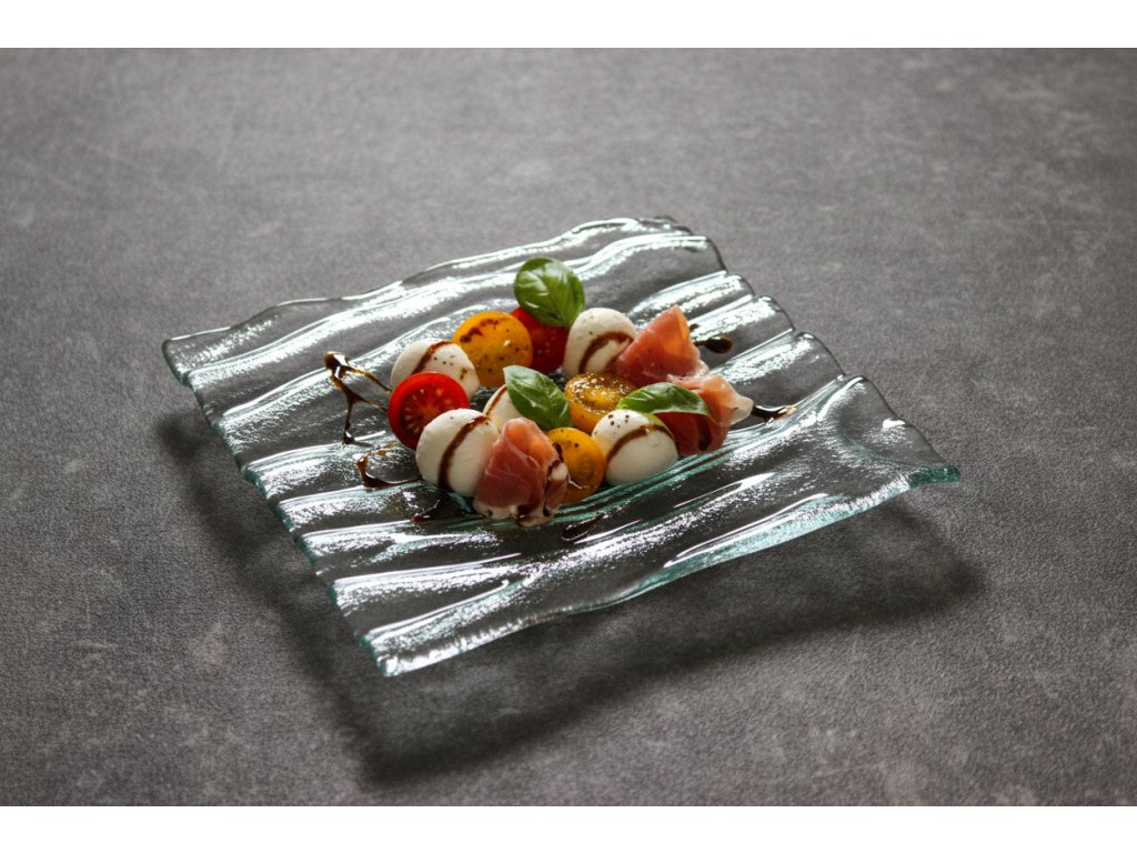 Originální čtvercový skleněný talíř, který na první pohled zaujme plastickým „vlnitým“ povrchem. Středová vnitřní plocha o rozměru 8 × 8 cm je hladká a ideální pro servírování menších porcí – dezertů, předkrmů, degustačních chodů nebo fingerfoodu. Talíř se skvěle hodí pro slavnostní stolování, rauty i designové servírování v restauracích.