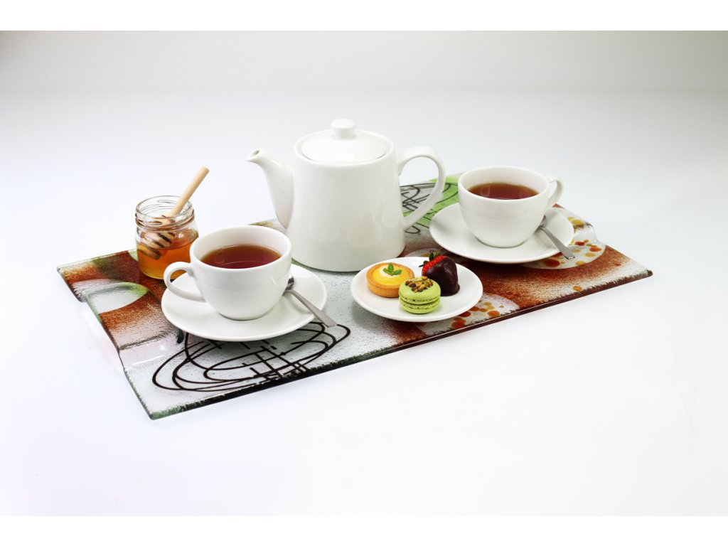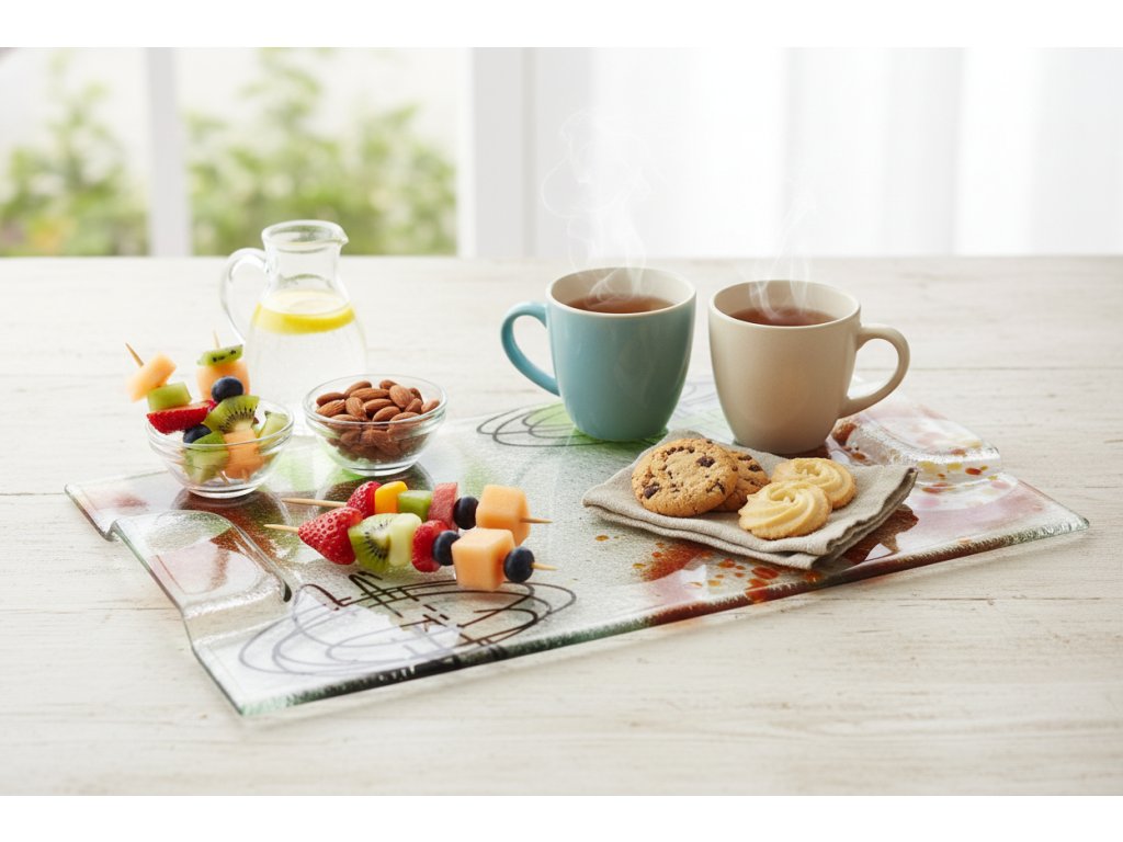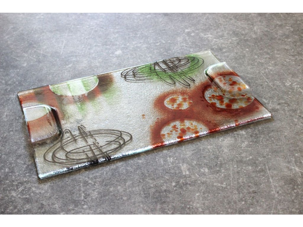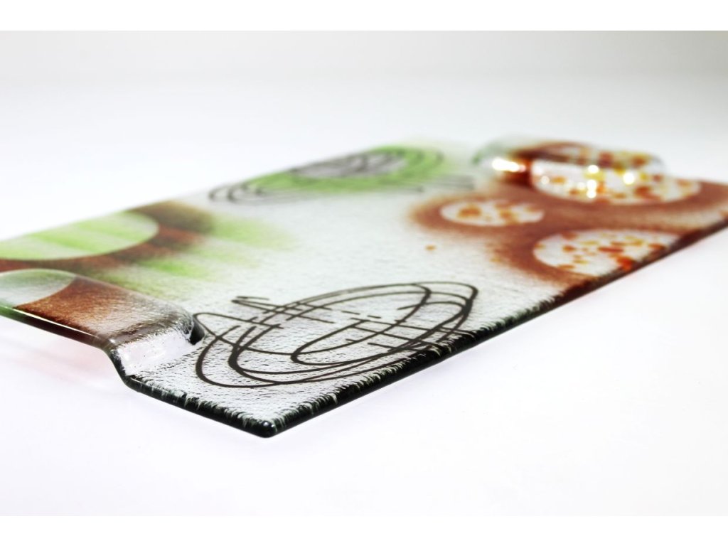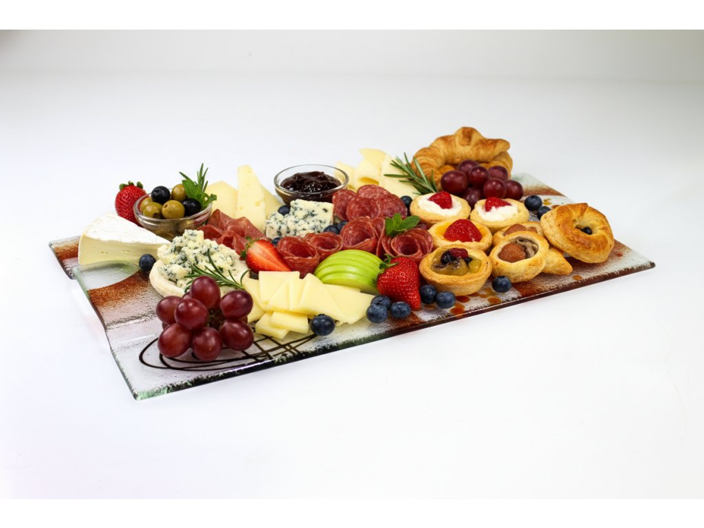Netradiční skleněný podnos, který promění každé servírování v malý umělecký zážitek. Díky rozměru 40 × 25 cm nabízí dostatek prostoru pro servírování chlebíčků, jednohubek, dezertů, sýrů, zákusků či drobného občerstvení na rodinných oslavách, rautu nebo při posezení s přáteli.