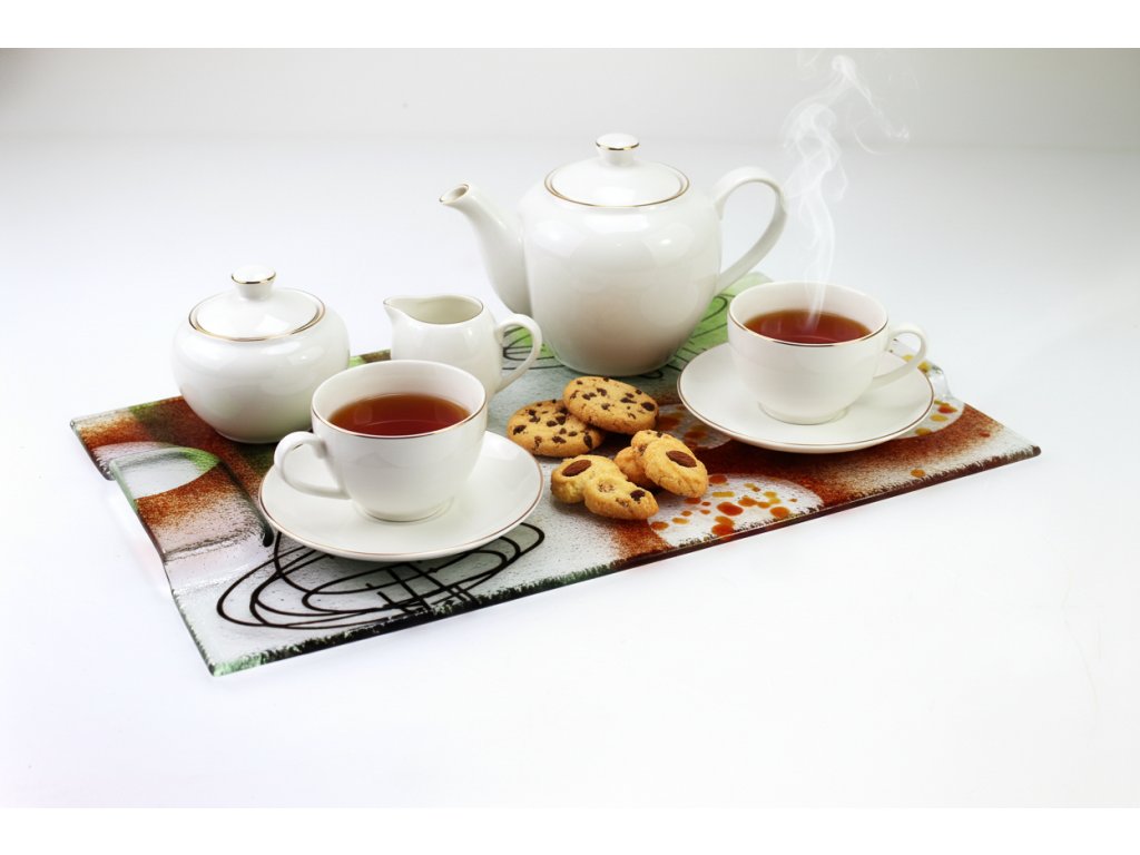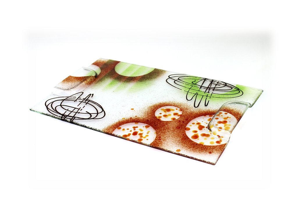 Povrch podnosu je ručně malovaný skleněnými fritami originálním motivem v tónech zelené, tmavě červené a oranžové, doplněný decentními liniemi. Každý kus je proto jedinečný – žádné dva podnosy nejsou zcela stejné. Čiré sklo s malbou působí elegantně, snadno se kombinuje s dalším nádobím a dodá prostřenému stolu moderní, kreativní vzhled.