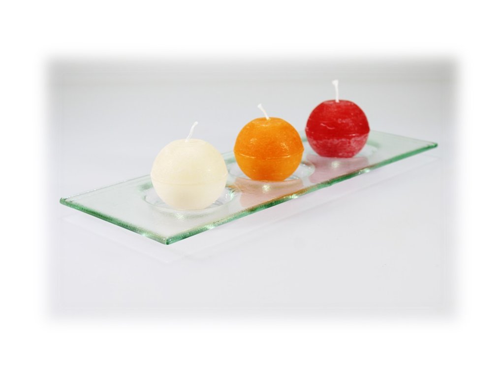 Svícen je vyroben z čirého skla, má 3 prohlubně oválného tvaru, do kterých lze umístit například svíčky koule - najdete v naší nabídce.