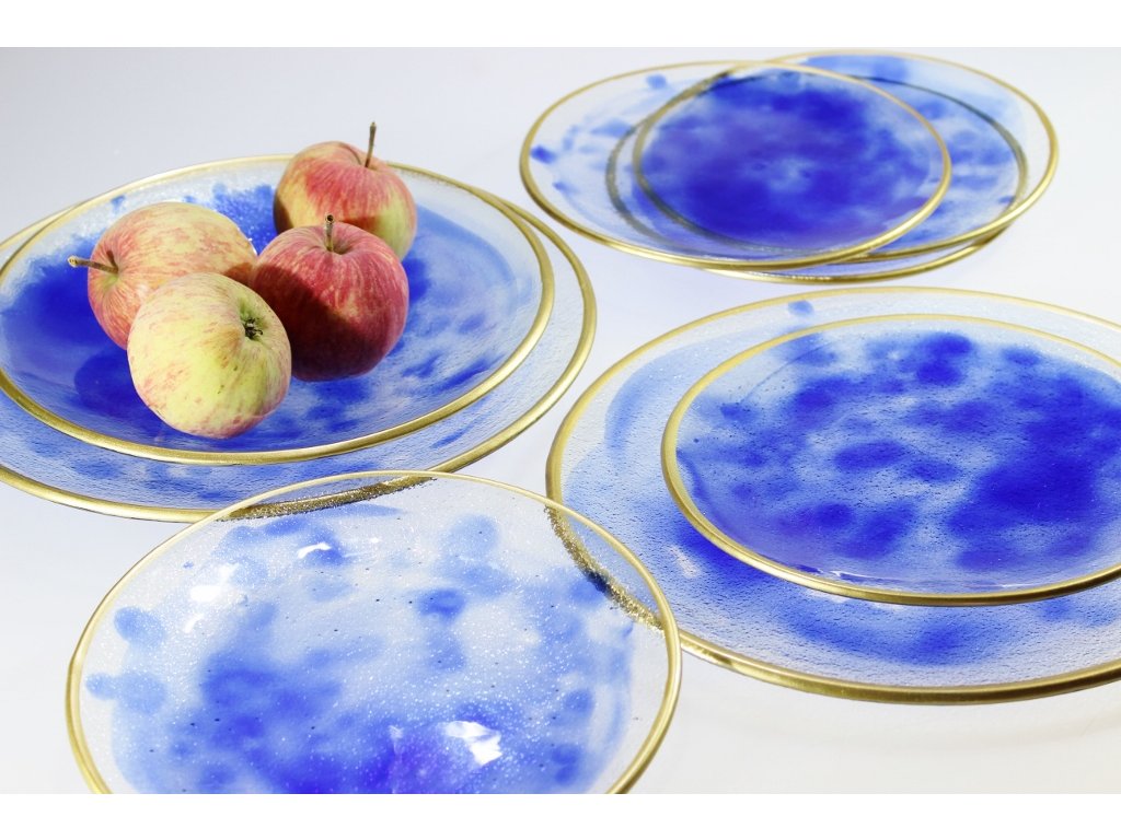 Skleněné talíře a mísy jsou vyrobené technologií fusing - lehané sklo. Dekor je ručně malovaný skleněnou fritou a je vypálený při 800-850°C, takže dekor nelze smýt a je stálý. Zlatý ráfek je také ručně malovaný organickou metalickou barvou, je zdravotně nezávadný a je možné jej mýt v myčce na nádobí.